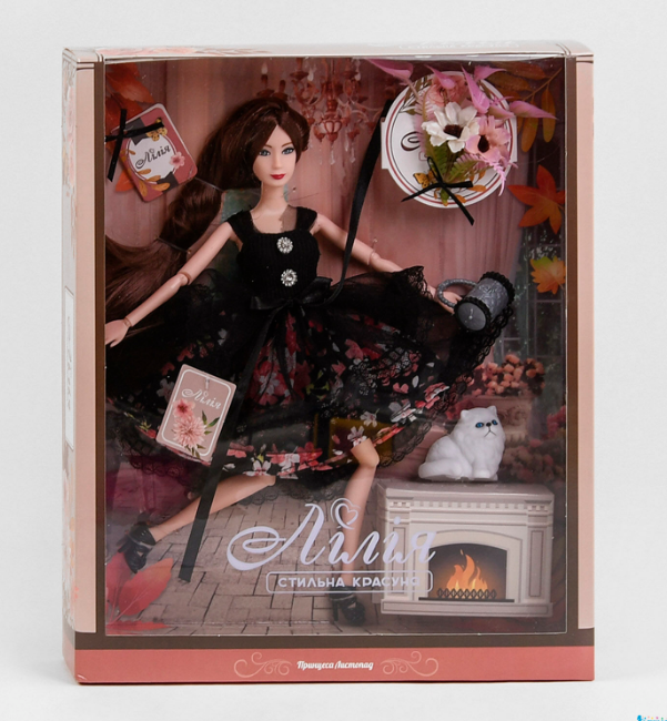 Стильна красуня проведе Вашу дитину в казковий світ золотих листя й проливних дощів. Чарівне вбрання принцеси відповідає її величчю: шикарне плаття з чорним топом у рубчик прикрашене дорогоцінними стразами, квітковою спідницею з чорними мереживними вставками та прикрасою на талії. Шоколадне шовковисте волосся укладене в елегантну зачіску. До комплекту входить трендова сумка, вихованець і букет квітів.